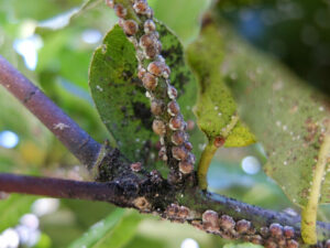 Дополнительно паразиты выделяют липкий секрет, который блестит на листьях. Падь является отличной питательной средой для развития еще одного патогена на растении – сажистого грибка (так называемой черни). Грибок закупоривает устьица листьев, препятствуя дыханию растений и завершает губительное дело щитовок.