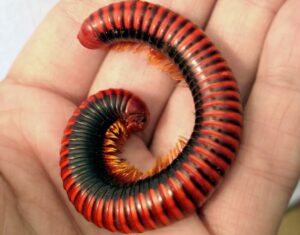 - Радужный кивсяк в окраске сочетает черные кольца, светло-серую или голубоватую спинку и красные бока. Живет 5 лет, длина 10-12 см, на голове заметный шип красного цвета.