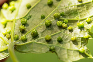 Весной из яйца появляется женская бескрылая особь – майская галлообразующая тля или прародительница. Листовая филлоксера хоботком прокалывает верхнюю поверхность листовой пластинки, при этом с нижней стороны образуется выпуклость – галла зеленого или красноватого цвета – которая обволакивает тело вредителя.