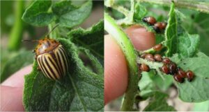 Самый опасный враг картофеля – колорадский жук и его личинки. Представитель семейства листоедов имеет заметную полосатую окраску, цвет оранжево-черный. Размеры 8-15 мм в длину, 7 мм в ширину.